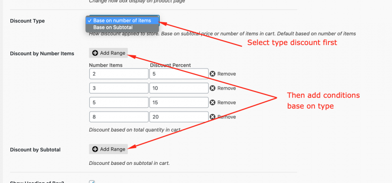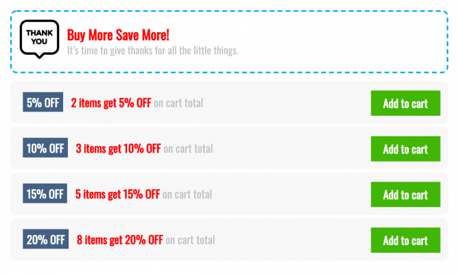 This feature will encourages customers to buy more products by offering discount amount base on number of products in cart or how many money they spent.