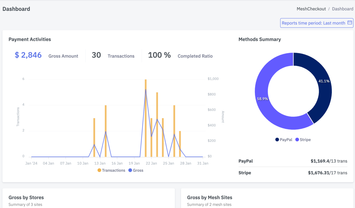 MeshCheckout giúp bạn quản lý các cổng thanh toán trên các store nhanh chóng và dễ dàng hơn. Bạn có thể thay account trên hàng chục store chỉ với vài thao tác trên MeshCheckout, không cần phải login từng store để thay đổi. MeshCheckout giúp cho các giao dịch thanh toán trên các account payment được an toàn hơn. Giảm rủi ro cổng thanh toán khi bán các sản phẩm trademark.