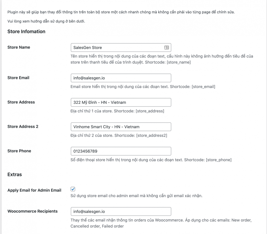 Sau khi cài đặt xong plugin, bạn vào menu Settings > Store Info để điền thông tin cho các shortcode.